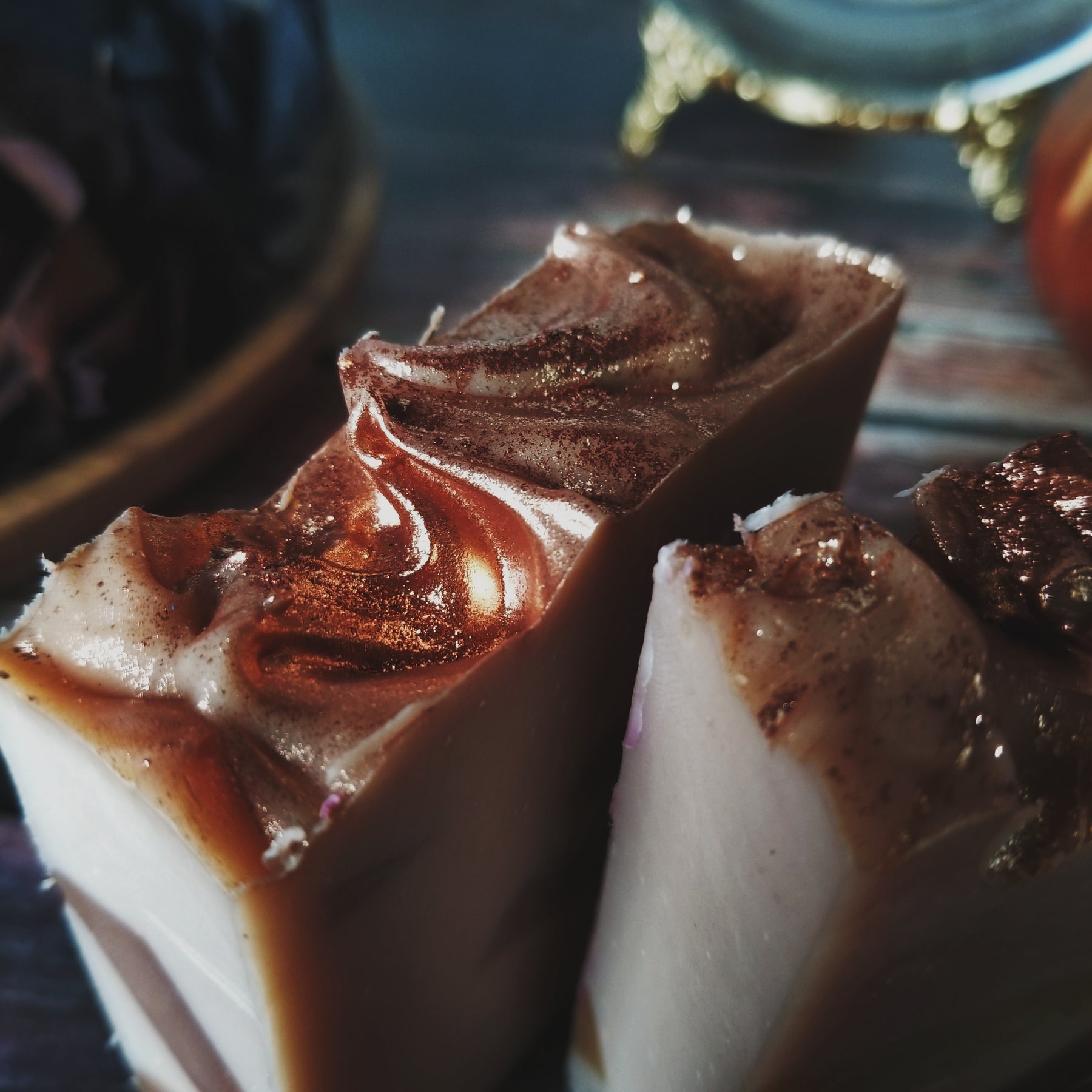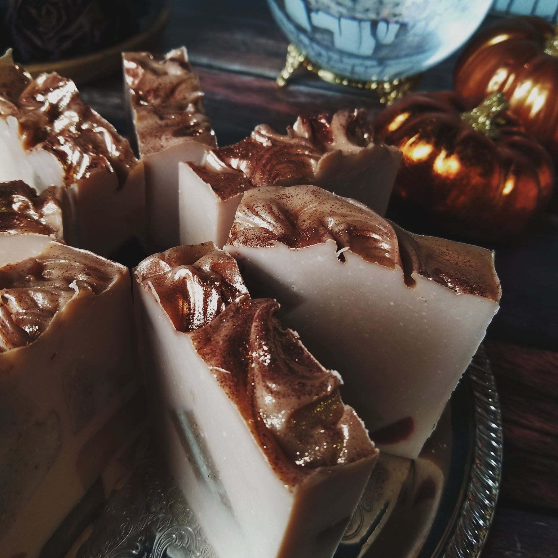 Ingredients: Elaeis Guineensis (Palm) Oil, Oryza Sativa (Rice) Bran Oil, Aqua (Water), Cocos Nucifera (Coconut) Oil, Sodium Hydroxide, Fragrance, Ricinus Communis (Castor) Seed Oil, Butyrospermum Parkii (Shea) Butter, Mangifera Indica (Mango) Seed Butter, Pumpkin, Mica, Titanium Dioxide, Iron Oxide, Cinnamon Powder, Nutmeg Powder, Clove Powder.